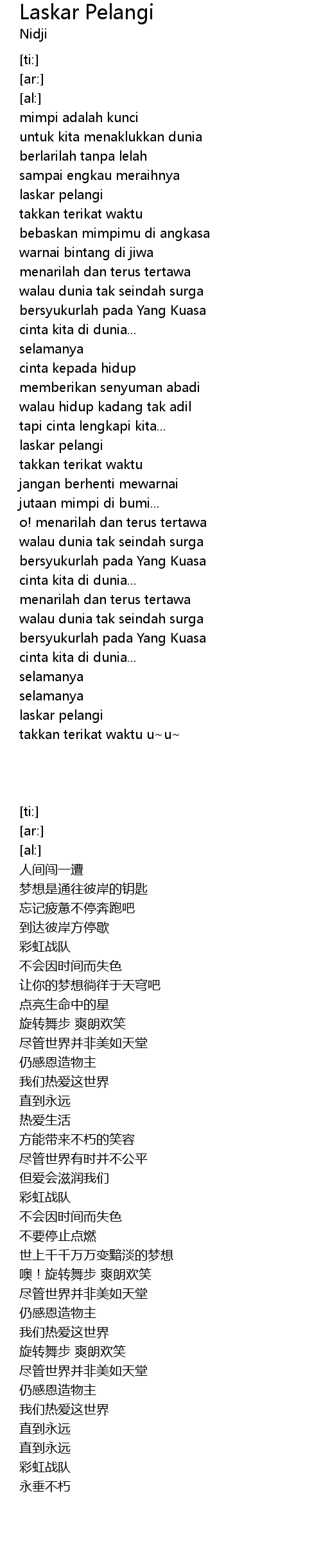 NIDJI - Laskar Pelangi (Lyrics) 🎵, NIDJI - Laskar Pelangi (Lyrics) Lyrics video for "Laskar Pelangi" by NIDJI Stream NIDJI - Laskar Pelangi: Spotify: . We Have got 5 pix about Laskar Pelangi Lyrics images, photos, pictures, backgrounds, and more. In such page, we additionally have number of images out there. Such as png, jpg, animated gifs, pic art, symbol, blackandwhite, pix, etc. "NIDJI - Laskar Pelangi (Lyrics)", Nidji #LaskarPelangi #WorldLyrics Spotify : https://open.spotify.com/track/1QUtm5 NIDJI - Laskar Pelangi (Lyrics) . "Nidji - Laskar Pelangi HD Lyric Video", i got a simple job to create a lyric video quick for the Nidji Concert at my previous school anyway.. why not ? , Nidji have many ..
